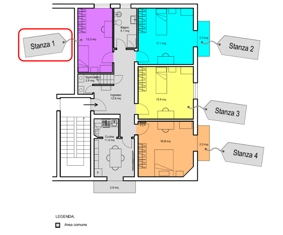 L’abitazione, di circa 97 m², è composta da quattro camere singole, una cucina con zona pranzo, un bagno, un ingresso spazioso e uno sgabuzzino comune.