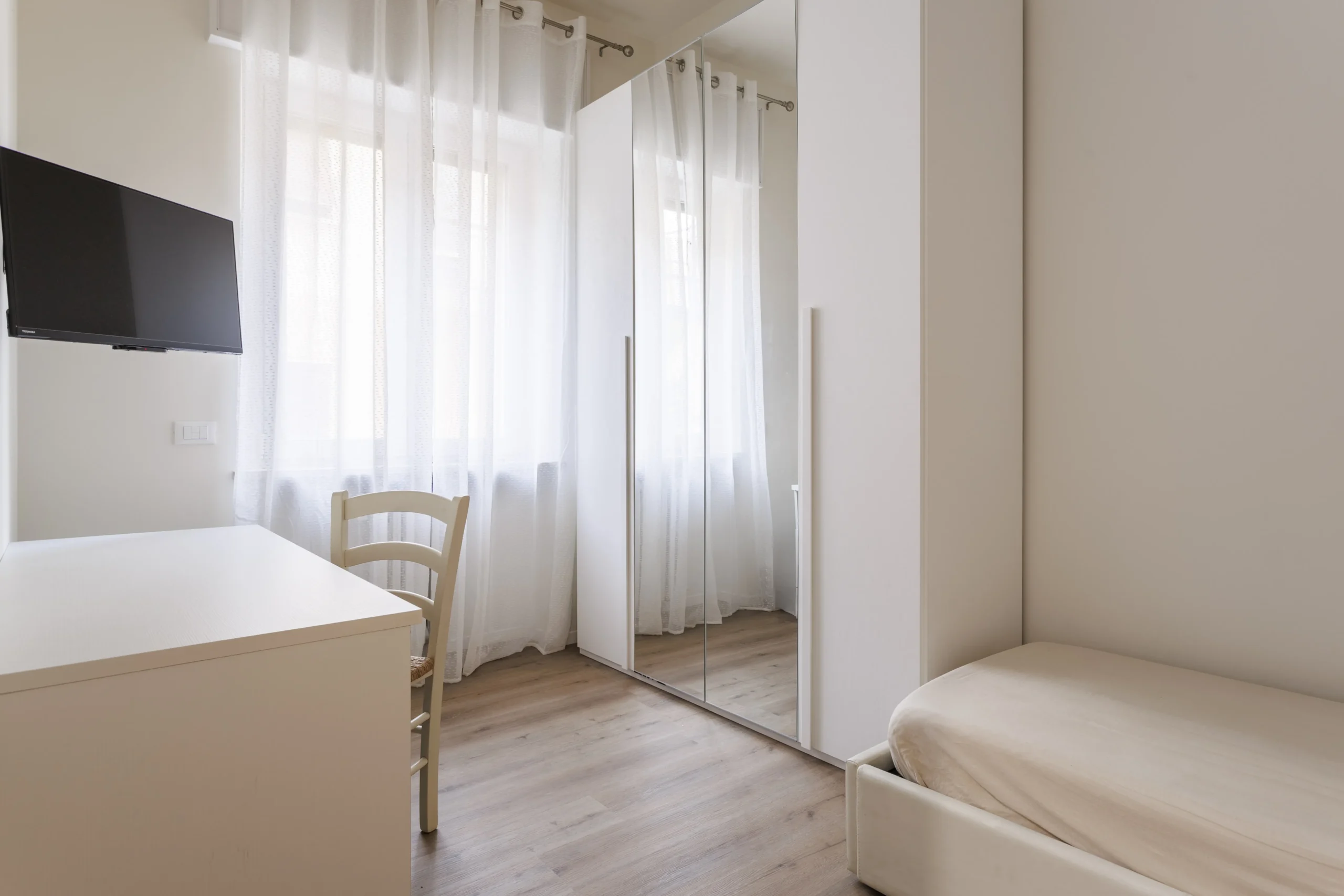 • Quattro camere singole, tutte arredate con letto, armadio, scrivania e televisione