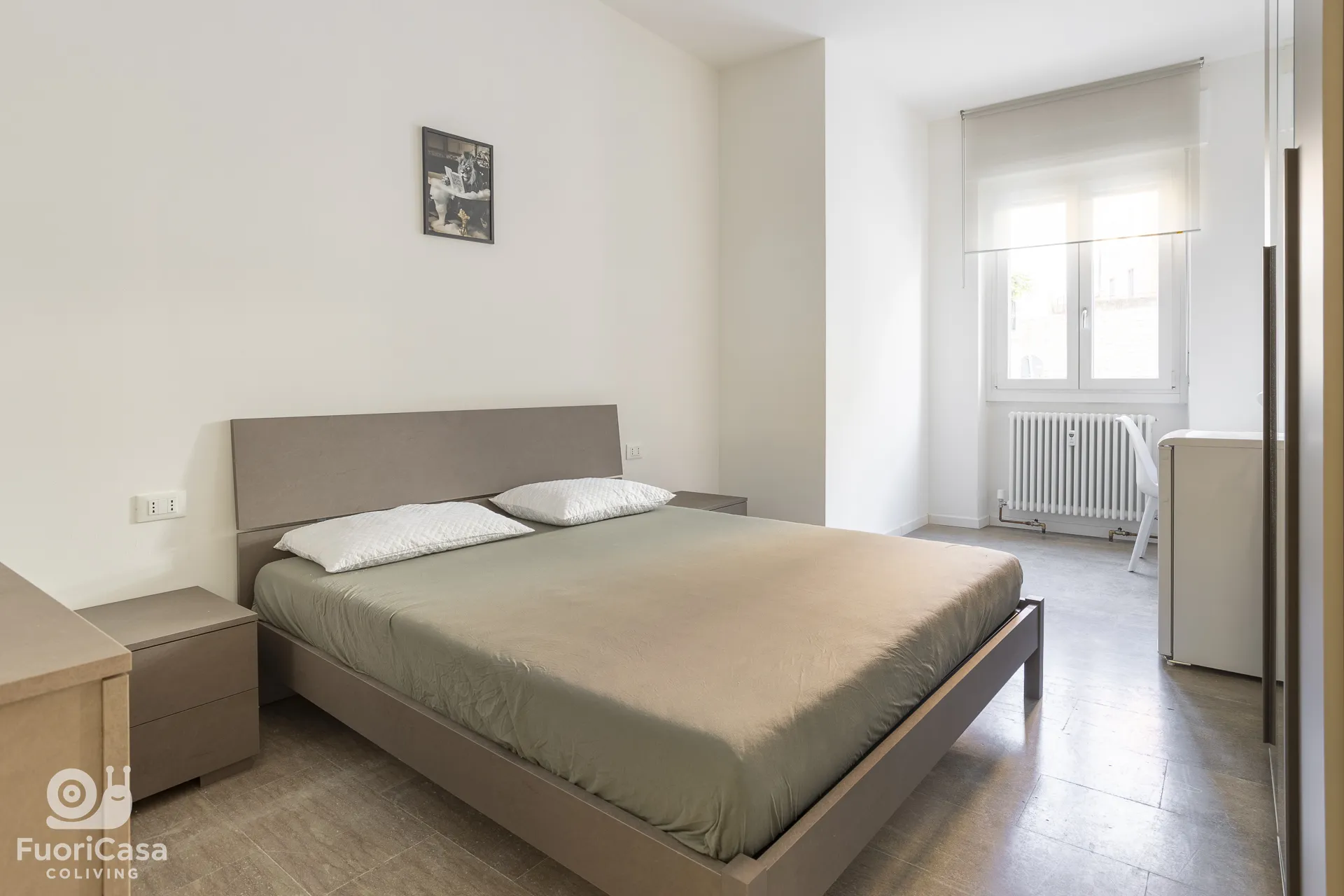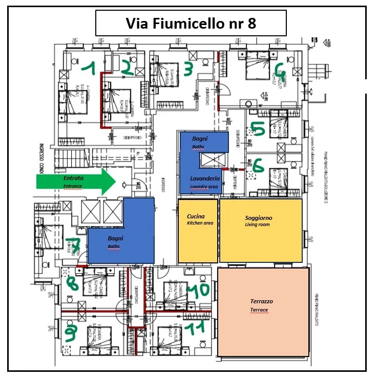 La struttura si trova al piano terra rialzato ed è composta da 11 camere singole arredate, 5 bagni con 3 docce, un’ampia cucina comune completamente attrezzata e un grande terrazzo condiviso. La camera è dotata di mini frigo.