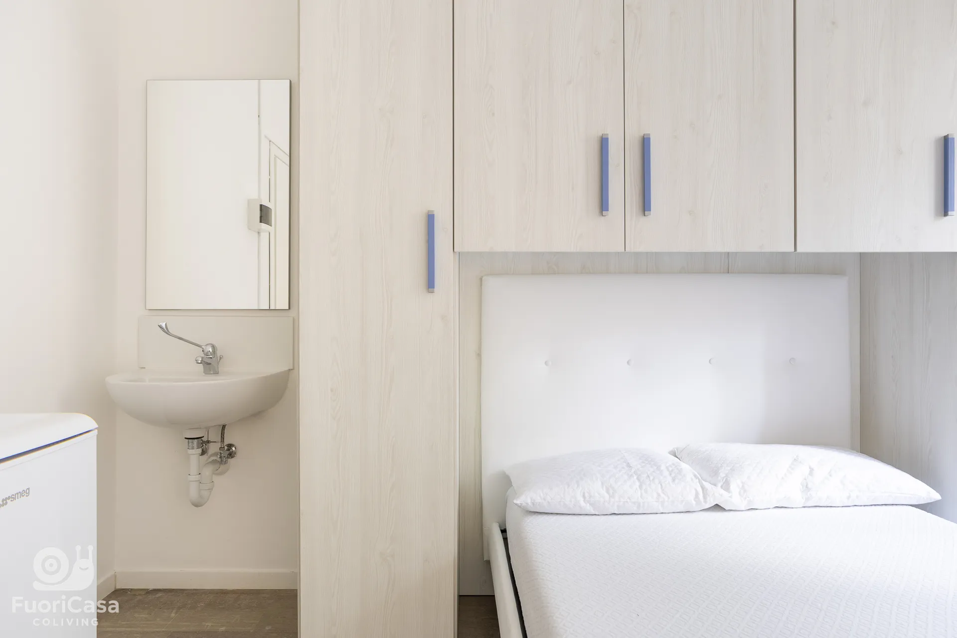La struttura si trova al piano terra rialzato ed è composta da 11 camere singole arredate, 5 bagni con 3 docce, un’ampia cucina comune completamente attrezzata e un grande terrazzo condiviso. La camera dispone di mini-frigo e un lavandino privato per una maggiore comodità.